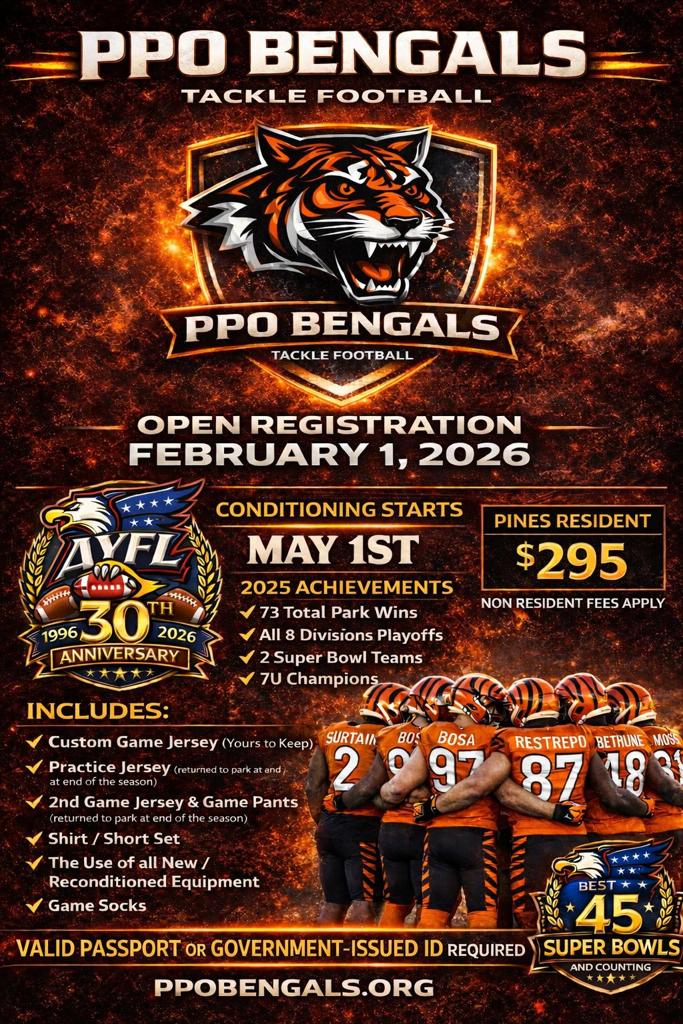 PPO Bengals has shifted to a FULLY online registration process. ALL REGISTRATION AND PAYMENTS MUST BE MADE ONLINE USING THIS WEBSITE. Pembroke Pines Optimist Club NO LONGER accepts cash or registration forms submitted on paper. Scroll down for detailed information.